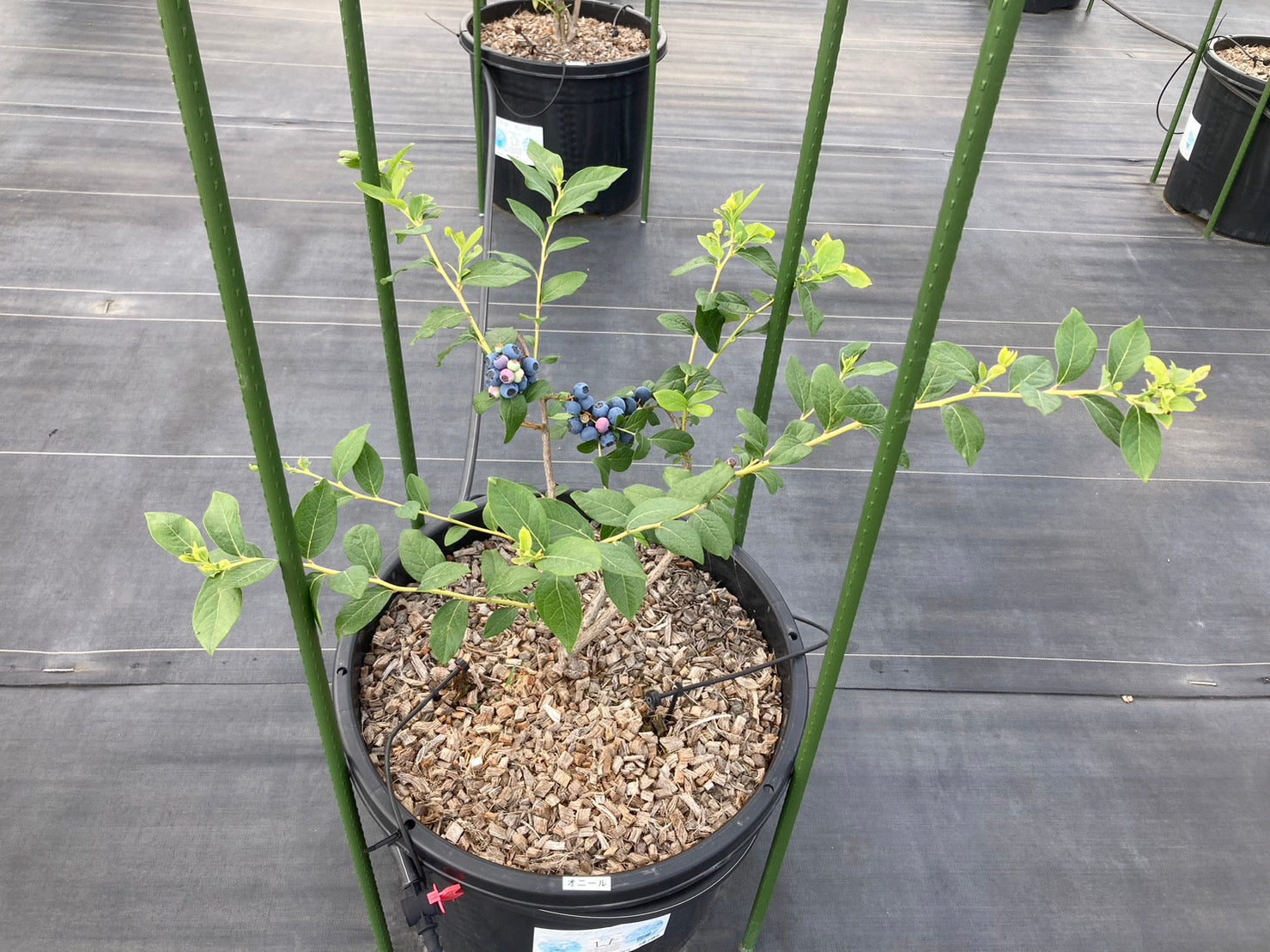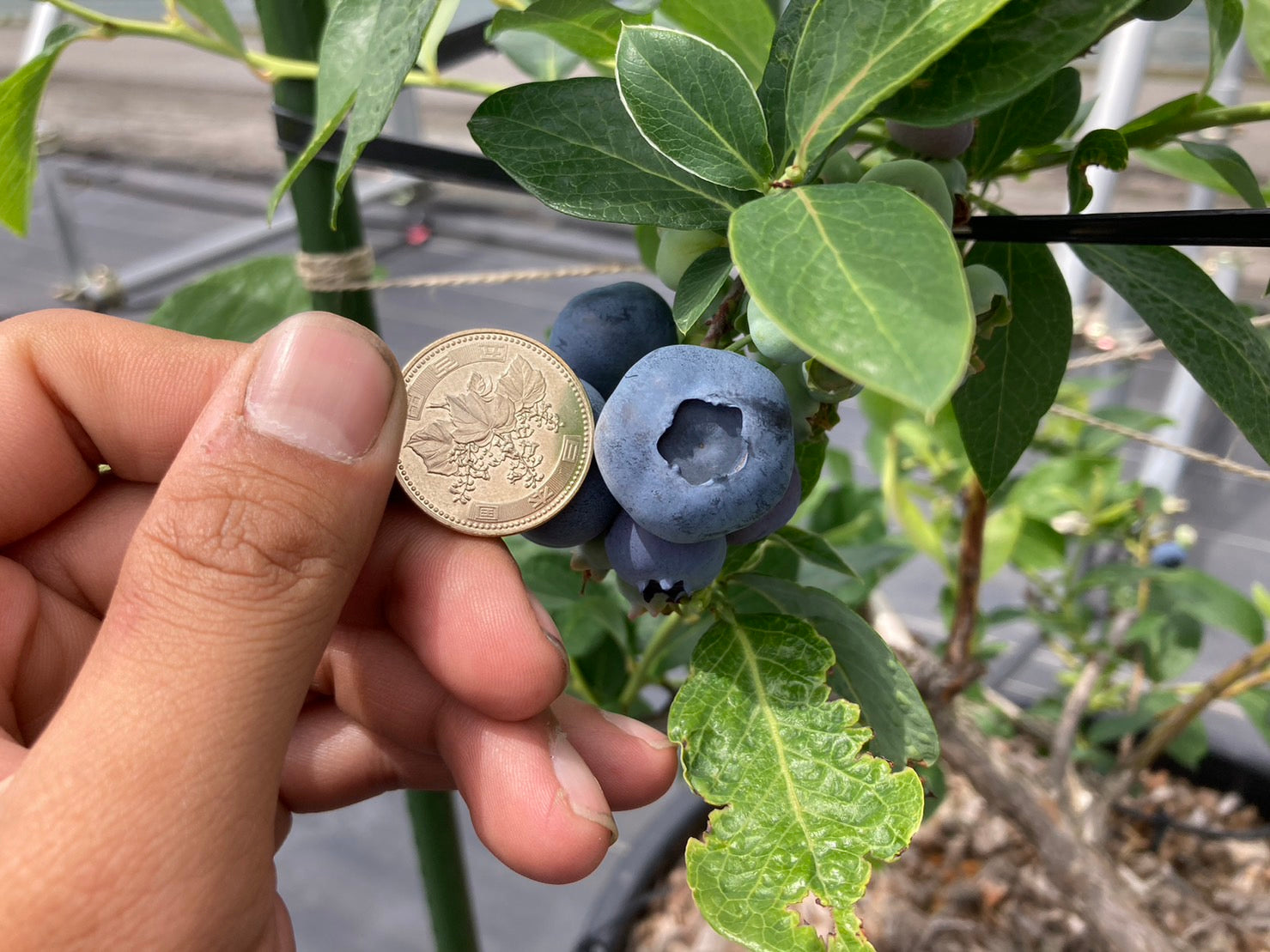 出ました!目を疑うようなサイズのブルーベリーです。先日紹介した100円玉サイズのブルーベリーがついていた木とはまた別の木(品種は同じヌイです)です。これでもまだ完熟ではありません。食べたらどんな印象なのか楽しみでしょうがないです。今年は数が大分限らてしまいますが、来年の正式オープン時にはお客様を驚かせらるようなこういった実をたくさん付けられる様にしていきます!