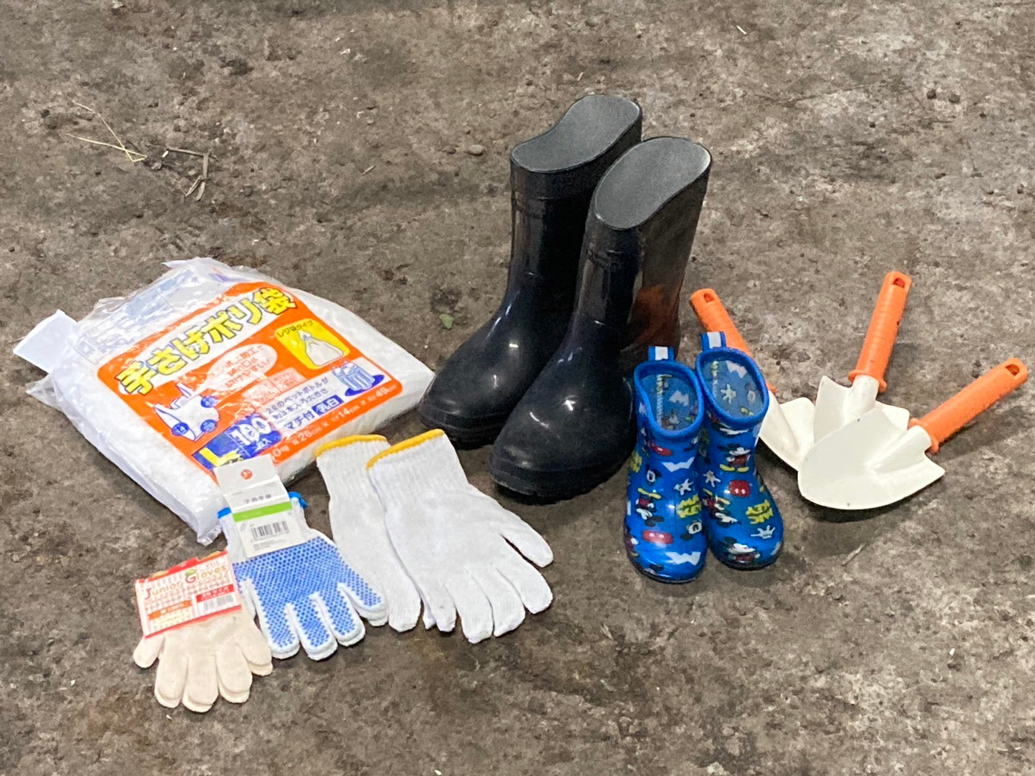 シャベル、長靴、軍手など必要なものは、現地で無料レンタルまたは購入することができますので、手ぶらでお気軽にお越しくださいませ。お子様用のご用意もございます。